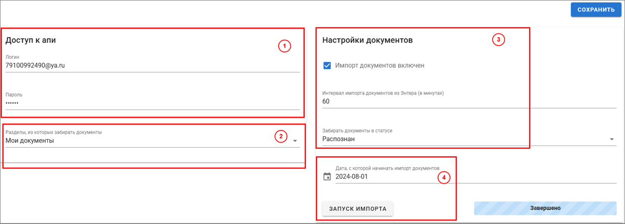 3) Включить импорт документов и установить необходимый интервал загрузки (рекомендуем оставить по умолчанию) и определить статус документов, в котором они будут импортированы, сохранить результат.