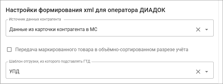 • Отметить «Прикреплять сформированный xml» при необходимости – если вам необходимо сохранять отправляемый в Диадок документ в оригинальном формате xml, можно отметить данную опцию, и он будет прикреплен к документу отгрузки в МС.
