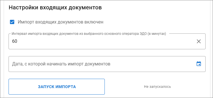 • Интервал импорта документов основного оператора. Минимальное значение 15 минут. Рекомендуем оставить значение по умолчанию.