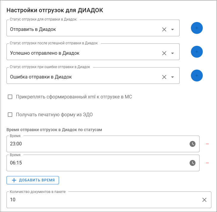• Настроить расписание по времени плановой отправки отгрузок в Диадок по статусу.