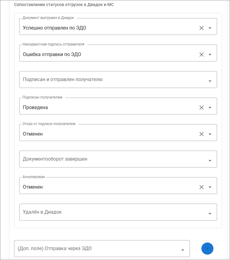 Вы можете сопоставить статусы, которые должны присваиваться документу «Отгрузка» в случае достижения соответствующего статуса в «Диадок». Это поможет вам отслеживать по статусам документа «Отгрузка» без посещения личного кабинета «Диадок». Статусы заранее должны быть созданы в разделе «Отгрузки"