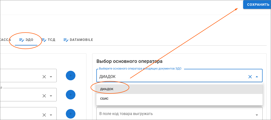 Первый шаг - Выбрать основного оператора по умолчанию Диадок или СБИС и сохранить результат (кнопка "Сохранить в правом верхнем углу).
