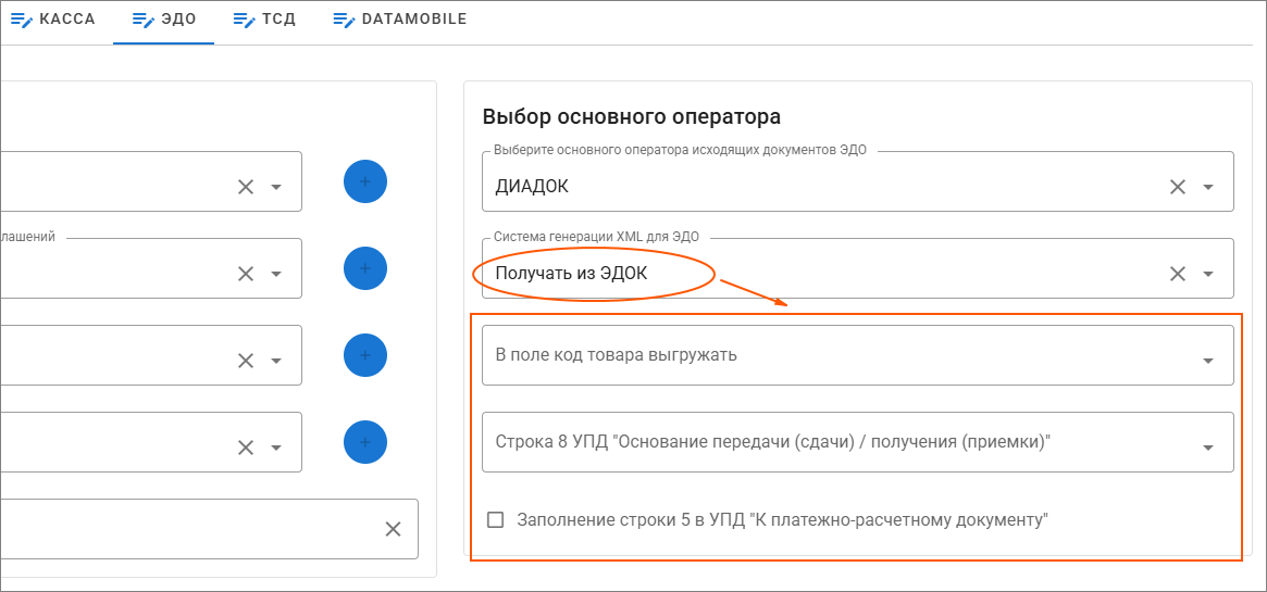 • Отметить «Получать печатную форму из ЭДО» при необходимости (опция в стадии доработки).