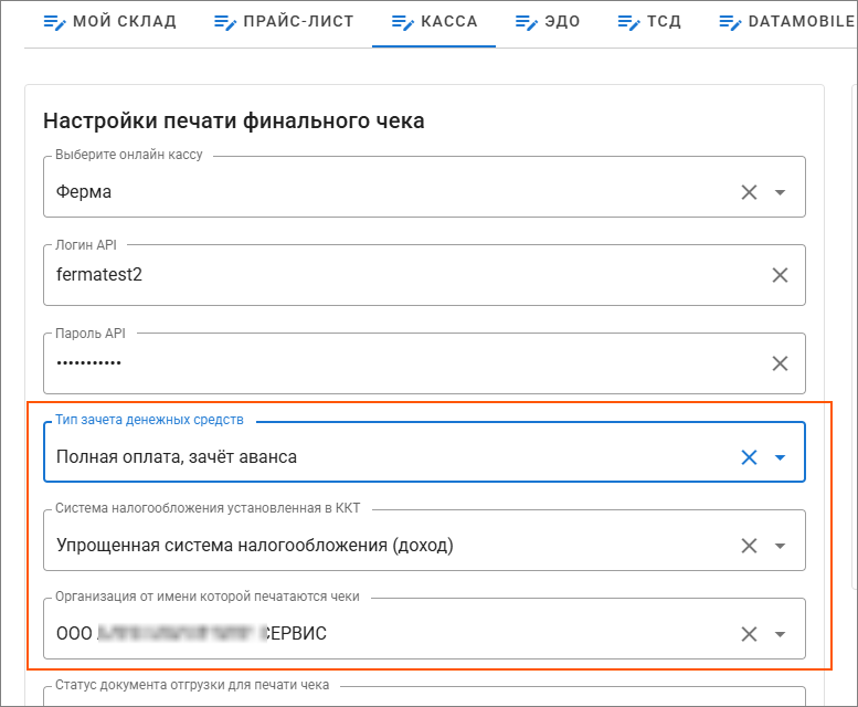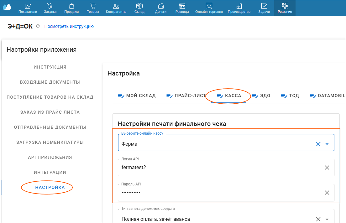 Модуль ЭДОК позволяет настроить выпуск первого и (или) второго чека в интерфейсе МойСклад.