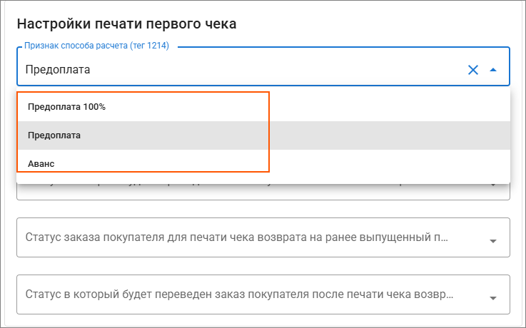 Затем вернуться в приложение, обновить страницу и, из раскрывающихся списков, выбрать нужные статусы. Сохранить результат. На этом настройка печати финальных чеков завершена.