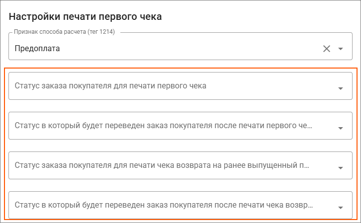Затем вернуться в приложение, обновить страницу и, из раскрывающихся списков, выбрать нужные статусы. Сохранить результат. На этом настройка печати первых чеков завершена.