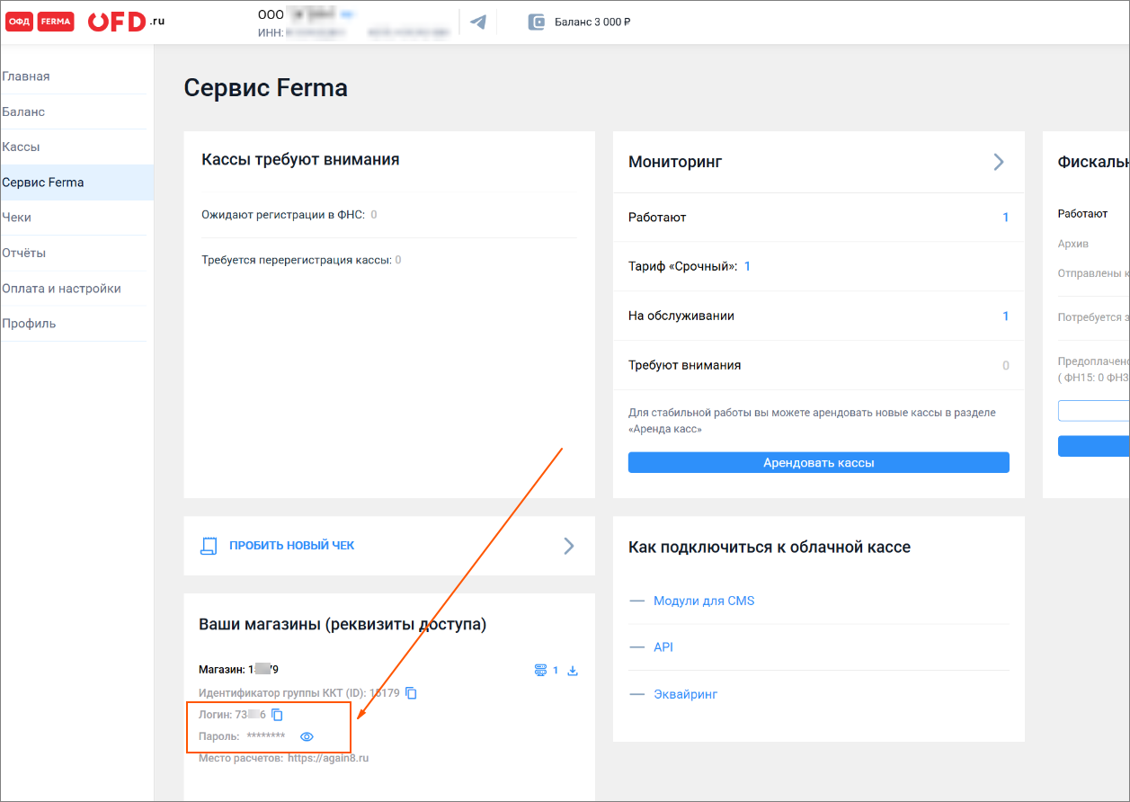 Для настройки печати чеков необходимо получить в личном кабинете кассы Ферма логин API и пароль