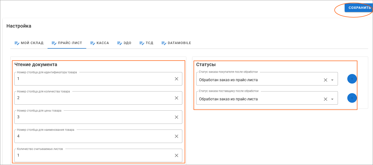 Для настройки загрузки прайс-листа необходимо выставить необходимые параметры чтения прайса (в каком столбце находятся какие данные) и статусы заказа после успешной обработки прайса.